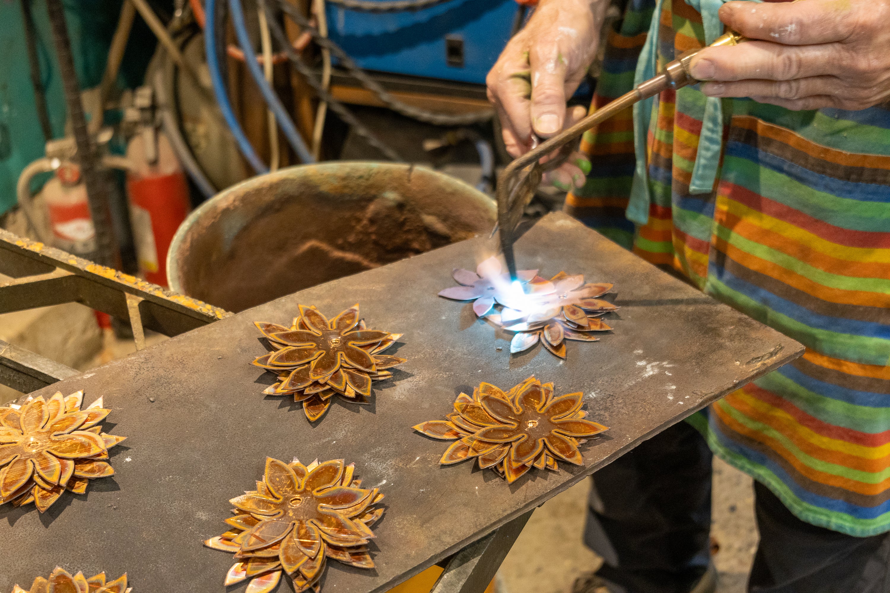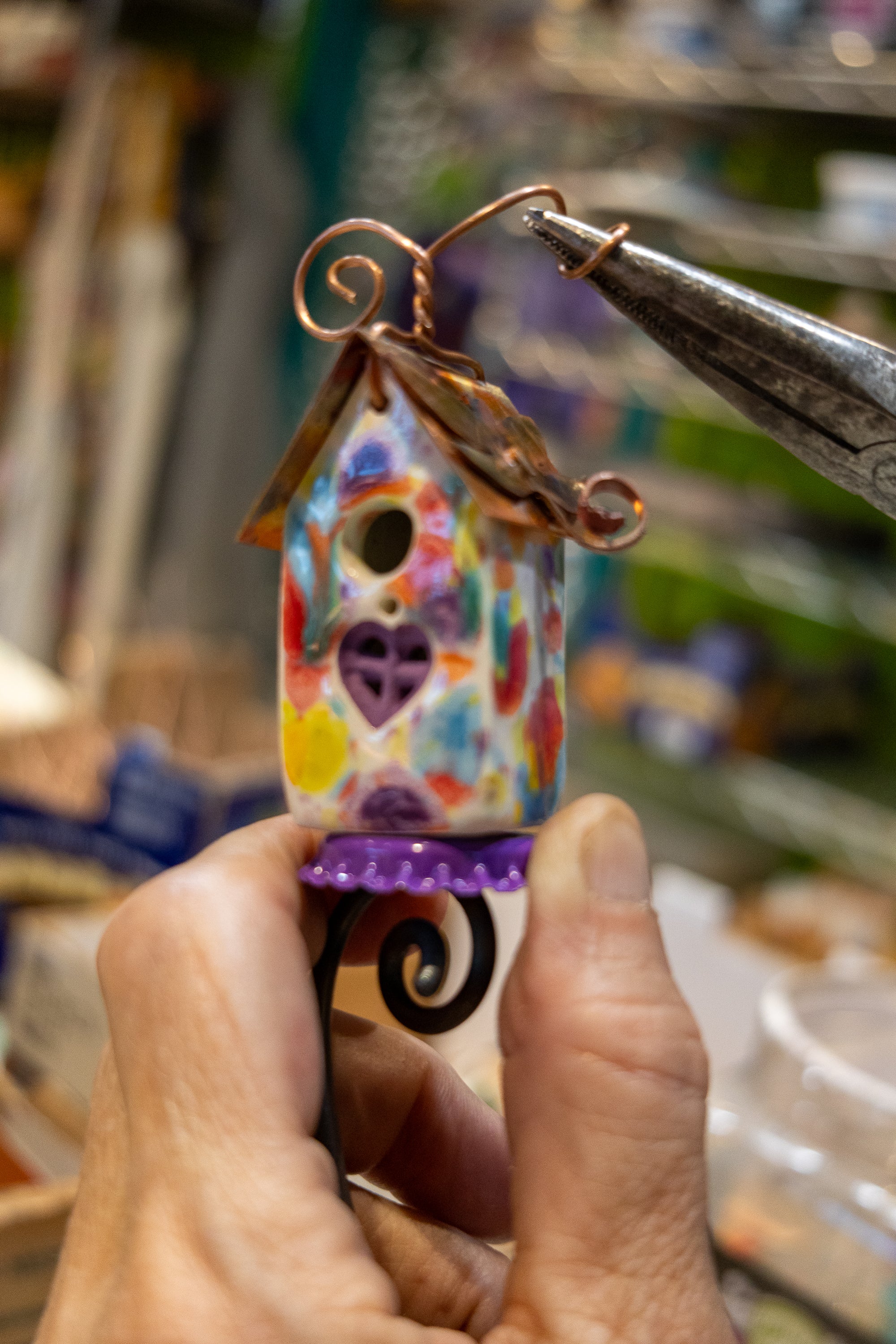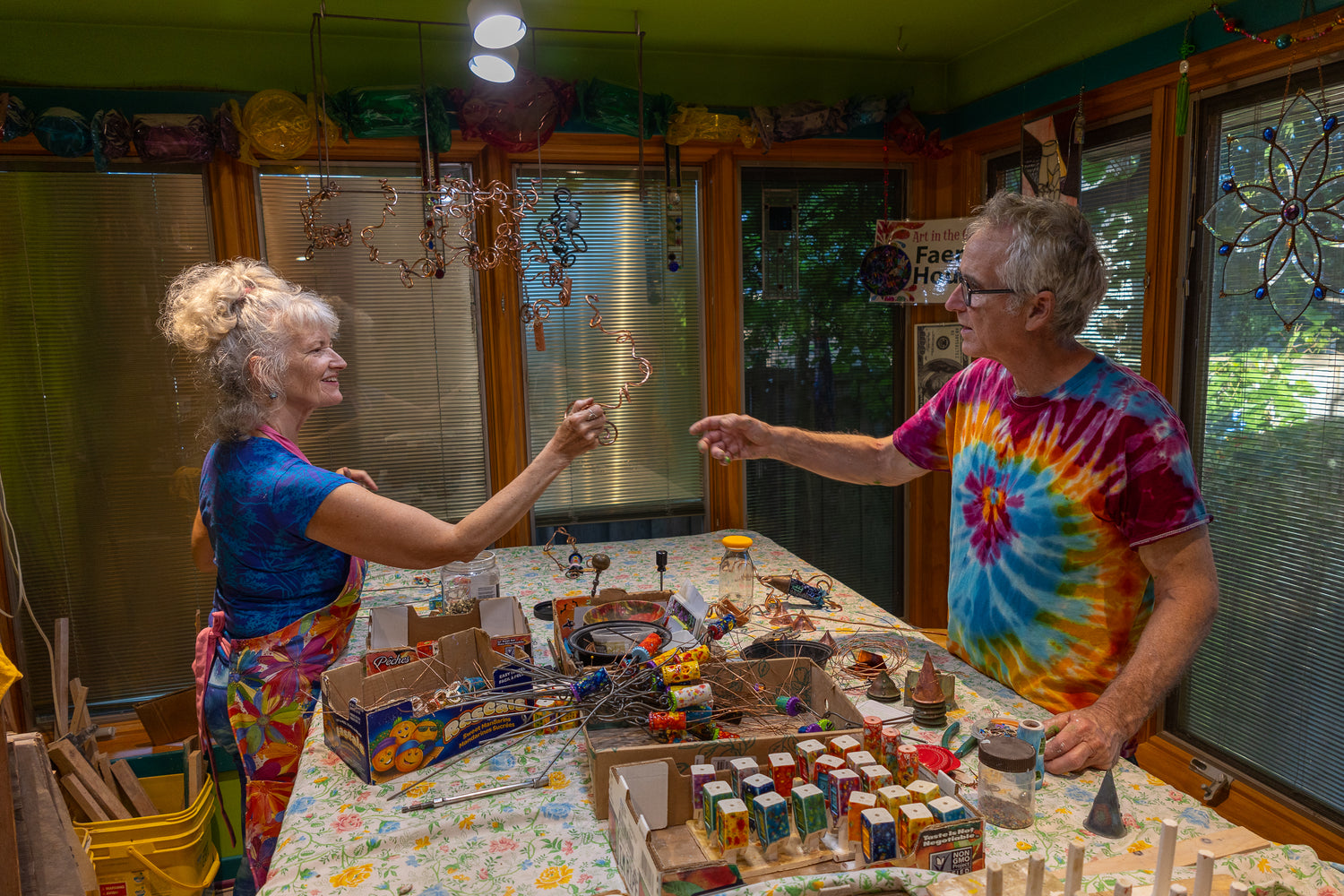 Frank and Bell Barr began the Faerie House in 1997. In 1998 they had their first full season of art fairs. The faeries have helped guide the evolution of the Faerie Houses. While the houses are adorned with architectural detail like window eaves and boxes, they don't need these things, just our imaginations. The faeries encourage us to tuck a bell in each house to help us be aware of their presence. So even if you don't see your faeries, you'll be able to hear them when their wings flutter near the bell. Each Faerie House is hand-built from molding the clay to hand painting each house. This means that each Faerie House is unique. As the faeries would tell us, "The imperfect is perfect in its own way."