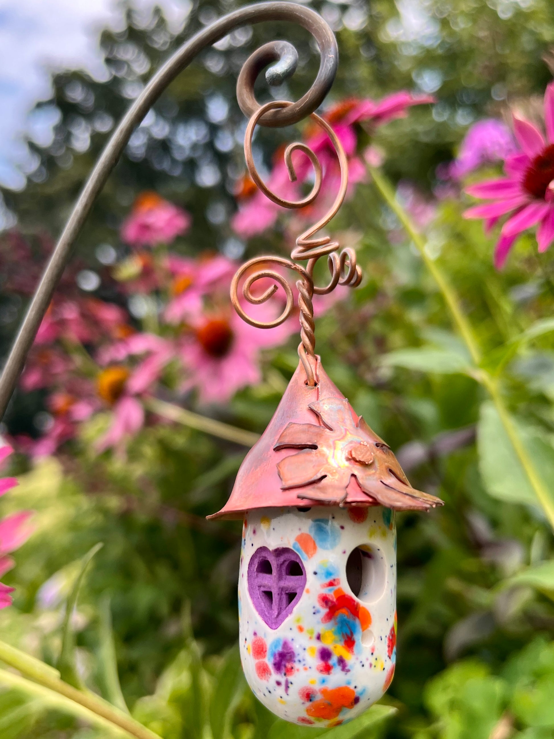 Leads with a purple love window. Raw copper flower on the roof. Perched on 12 inch twisted stem. Lands easily in a potted plant, window box, or faerie garden. Twisted steel stem is intended to naturalize (rust up nicely), providing a nice little vine looking perch for the home.