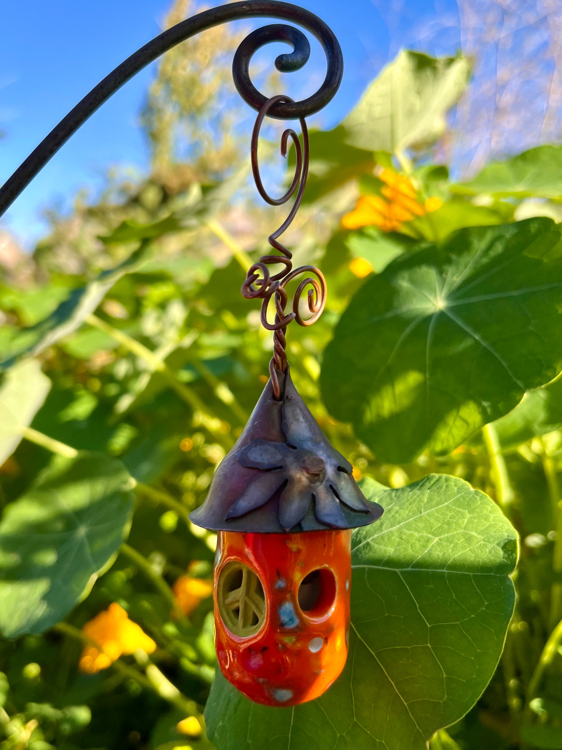 Leads with lime green peace window. Flower on the roof. Comes with 12 inch shepherds hook. Lands easily in a potted plant, window box, or faerie garden. Steel shepherds hook is intended to naturalize (rust up nicely), providing a nice little vine looking perch for the home. Curls may need fluffing after flight.