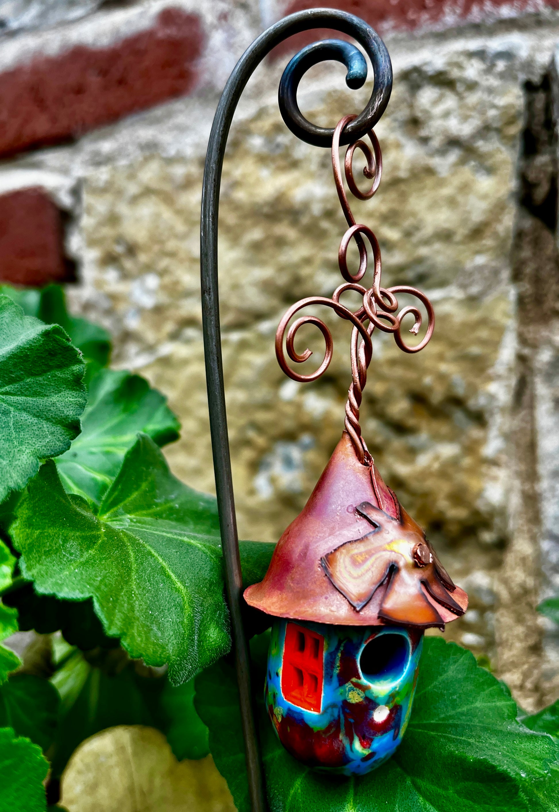 Butterfly on the raw copper roof. Comes with 12 inch shepherds hook. Lands easily in a potted plant, window box, or faerie garden. Steel shepherds hook is intended to naturalize (rust up nicely), providing a nice little vine looking perch for the home. Curls may need fluffing after flight.