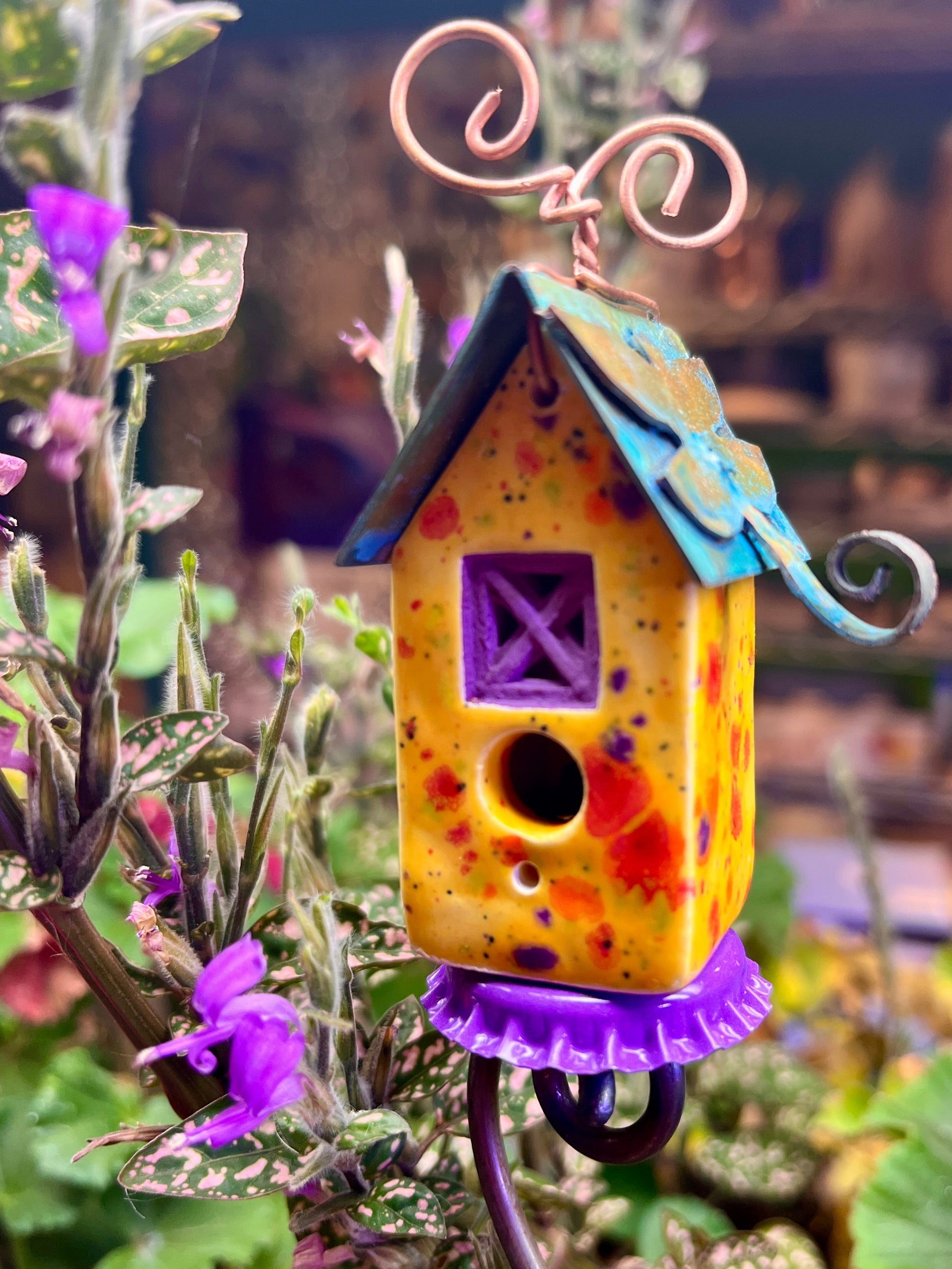 Dragonfly on the roof. Purple accents. Perched on 12 inch twisted stem. Nestles into any potted plant, window box, or faerie garden. The twisted steel stem is designed to naturalize beautifully over time, developing a rustic patina that mimics a delicate vine—creating an organic, lived-in look that only grows more magical with the seasons. *Curls may need fluffing after flight.