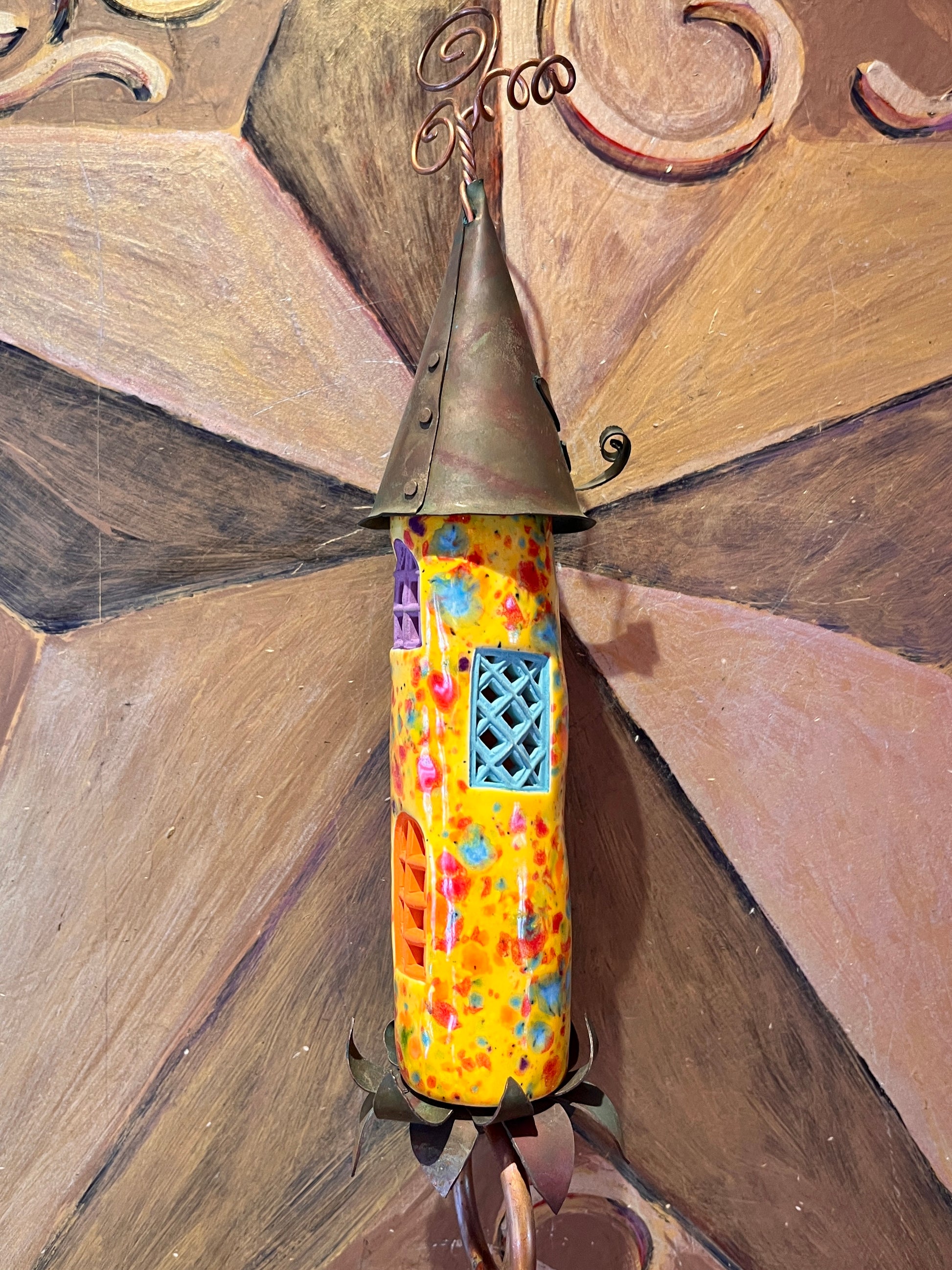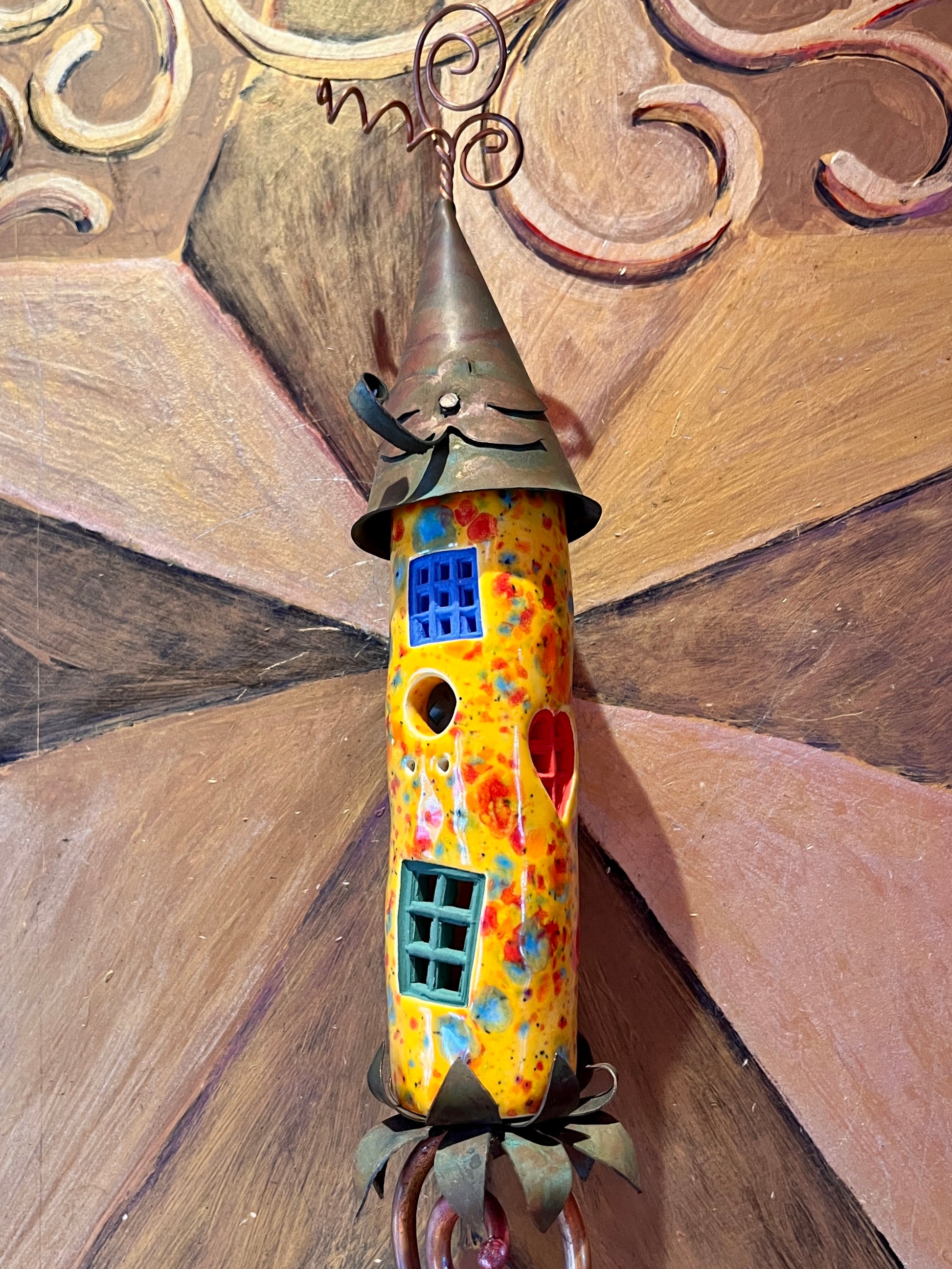 Multicolored windows. Dragonfly on the roof. 10 inch house (includes copper roof) is mounted on a 32 inch solid copper twisted stem. Great garden jewelry. Attracts indoor/outdoor faeries. Copper curls may need fluffing after landing.