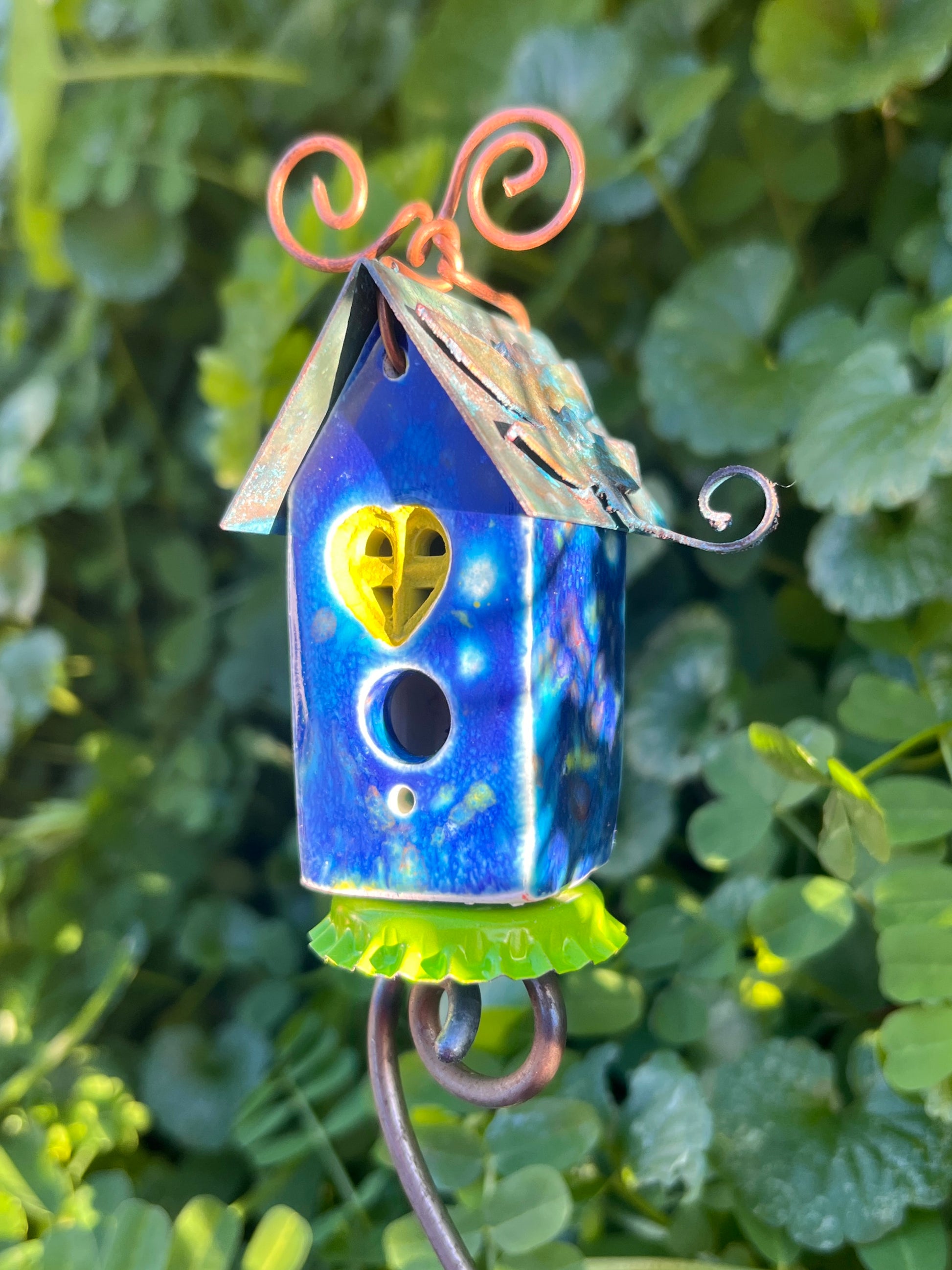 Leads with love. Dragonfly on the roof. Lime green accents. Perched on 12 inch twisted stem. Lands easily in a potted plant, window box, or faerie garden. Twisted steel stem is intended to naturalize (rust up nicely), providing a nice little vine looking perch for the home. Copper curls may need fluffing after landing.