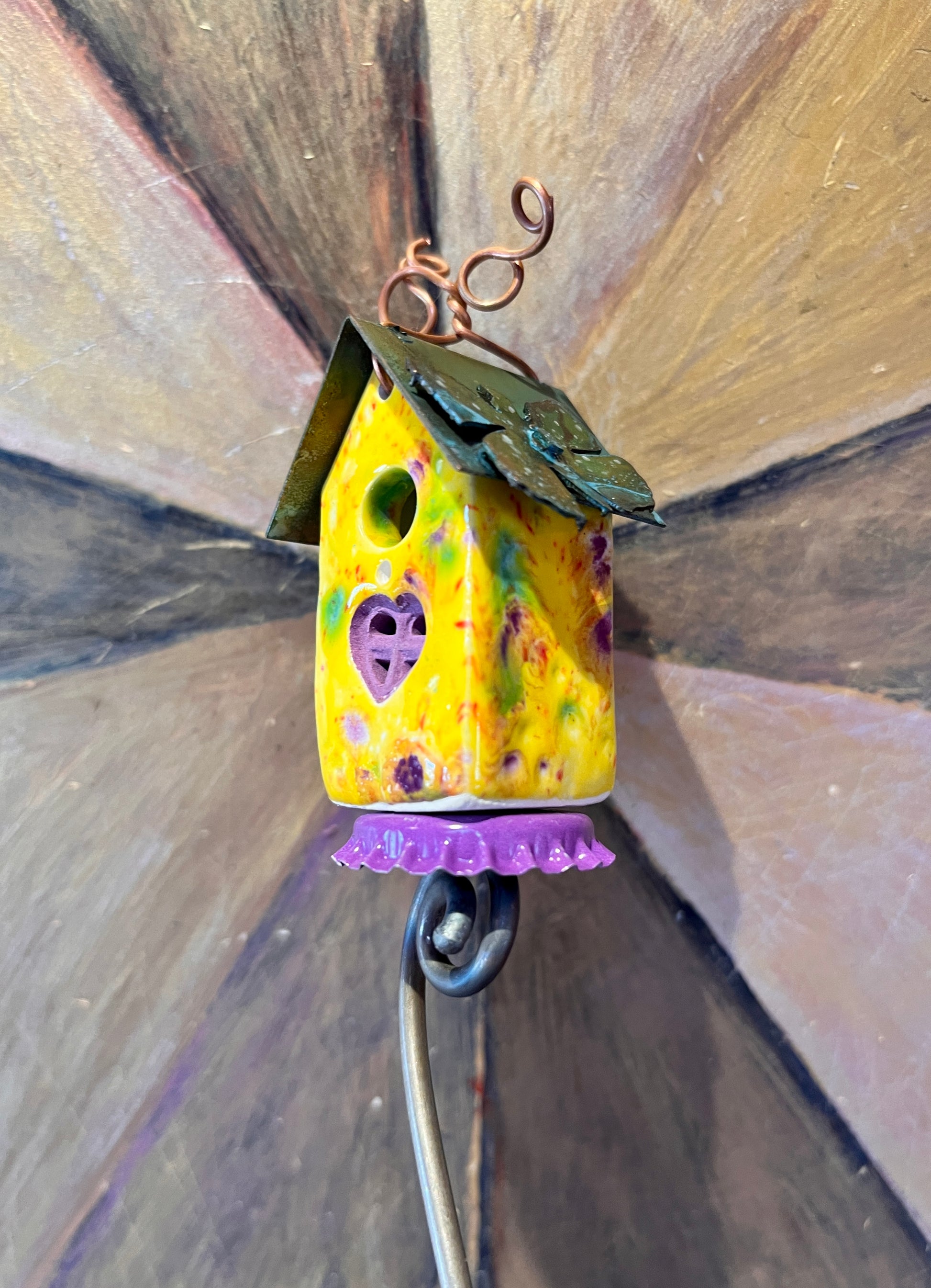 Leads with love. Butterfly on the roof. Purple accents. Perched on 12 inch twisted stem. Lands easily in a potted plant, window box, or faerie garden. Twisted steel stem is intended to naturalize (rust up nicely), providing a nice little branch looking perch for the home.