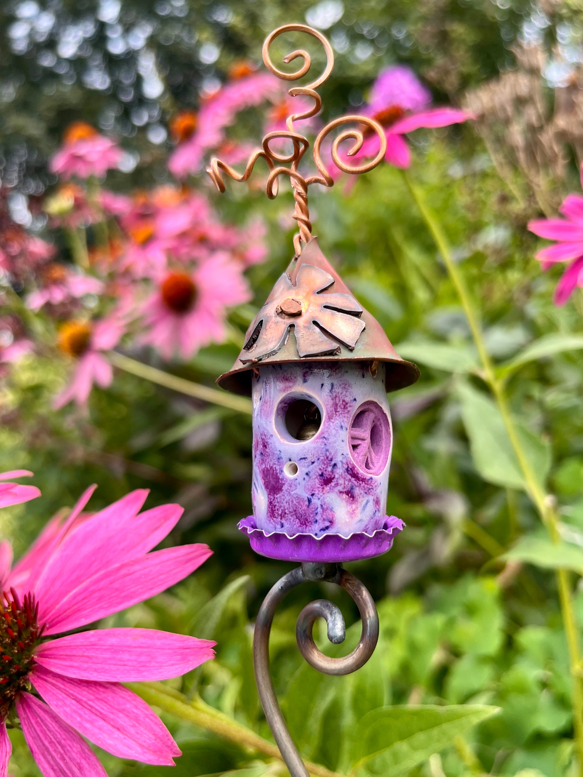 Flower on the roof. Purple accents. Perched on 12 inch twisted stem. Lands easily in a potted plant, window box, or faerie garden. Twisted steel stem is intended to naturalize (rust up nicely), providing a nice little vine looking perch for the home.
