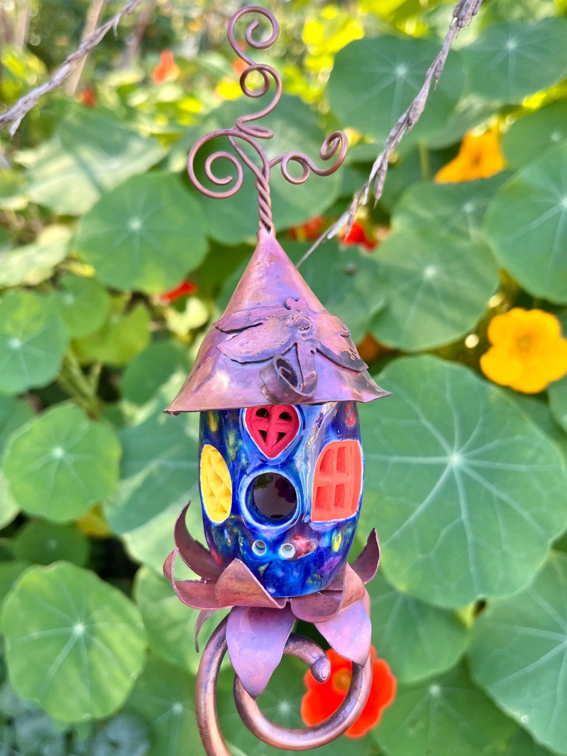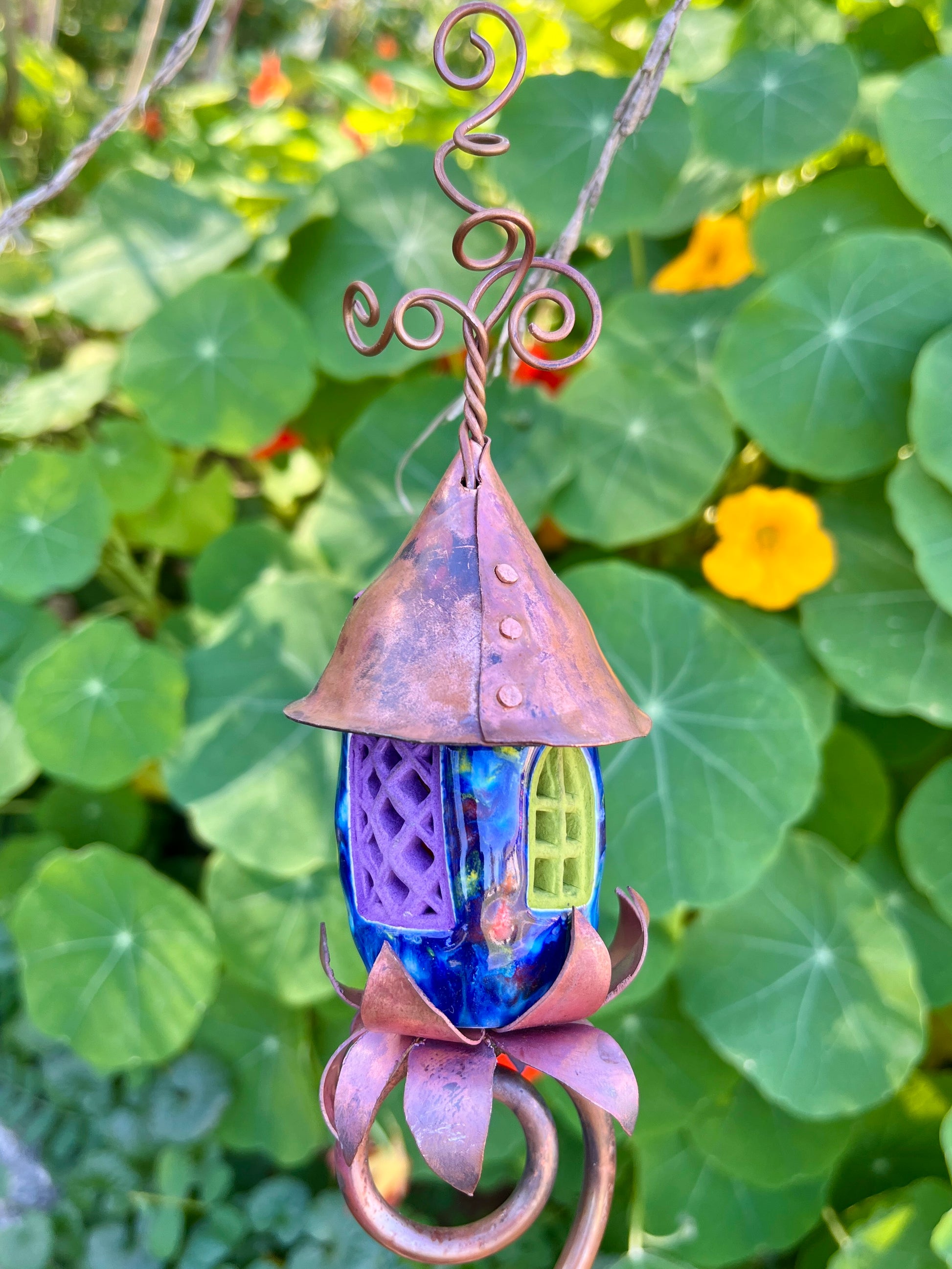 Raw copper dragonfly on the roof. Multicolored windows. Five inch house (includes copper roof) is mounted on a 32 inch solid copper twisted stem. Great garden jewelry. Attracts indoor/outdoor faeries. Curls may need fluffing after flight.