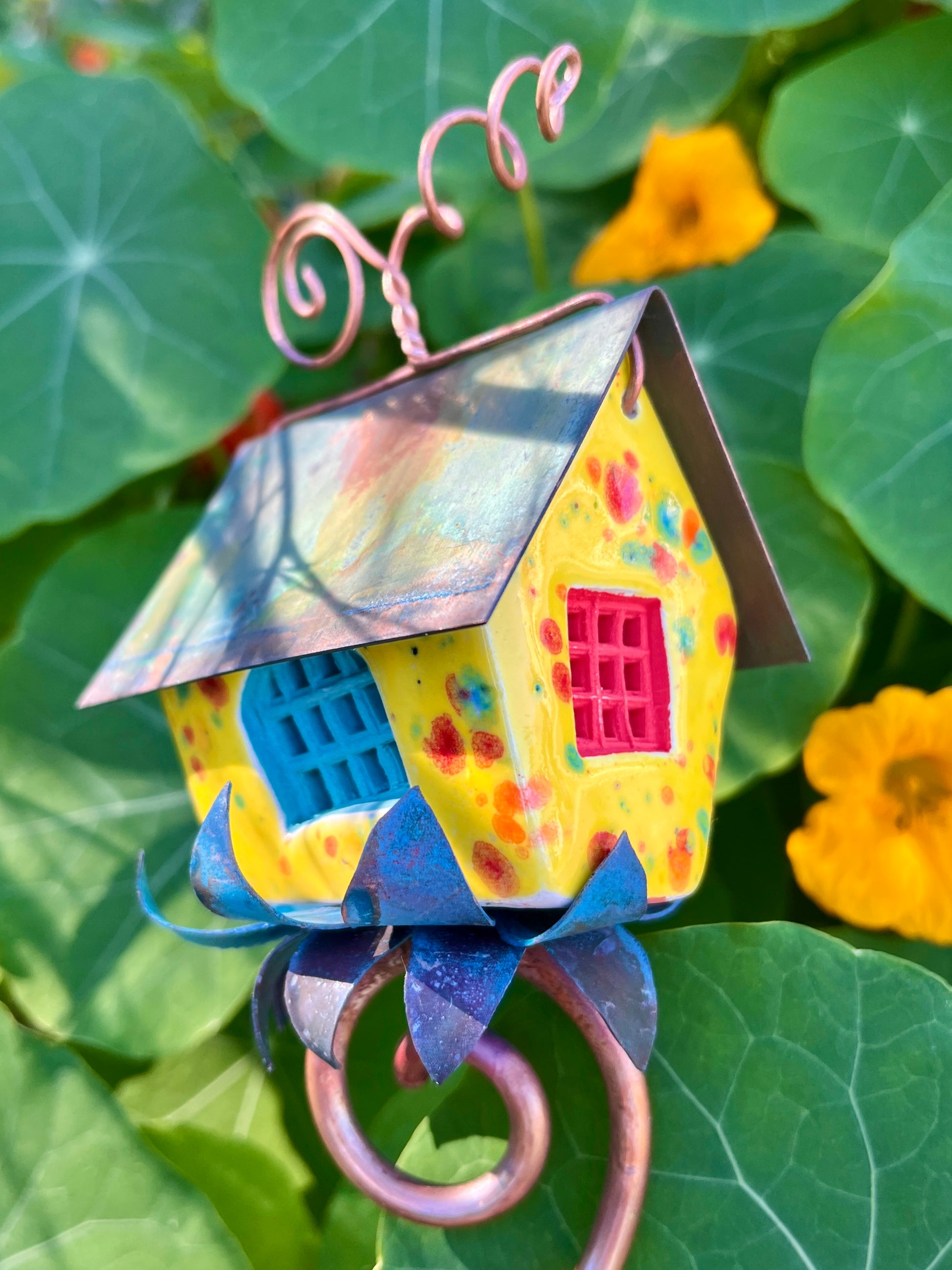 Dragonfly on the roof. Multicolored windows. Four inch house (includes copper roof) is mounted on a 32 inch solid copper twisted stem. Great garden jewelry. Attracts indoor/outdoor faeries. Curls may need fluffing after flight.
