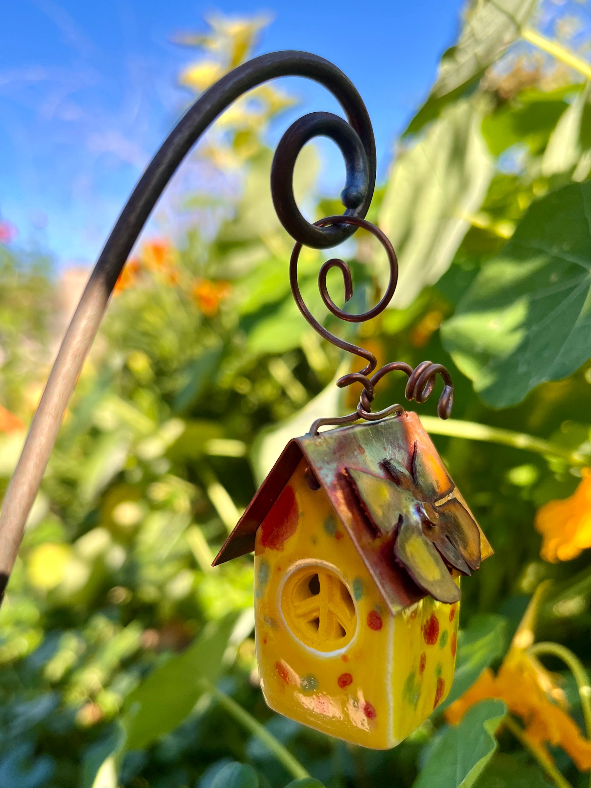 Yellow peace window. Raw copper butterfly on the roof. Includes 12 inch shepherds hook. Lands easily in a potted plant, window box, or faerie garden. Shepherds hook is intended to naturalize (rust up nicely), providing a nice little vine looking perch for the home.