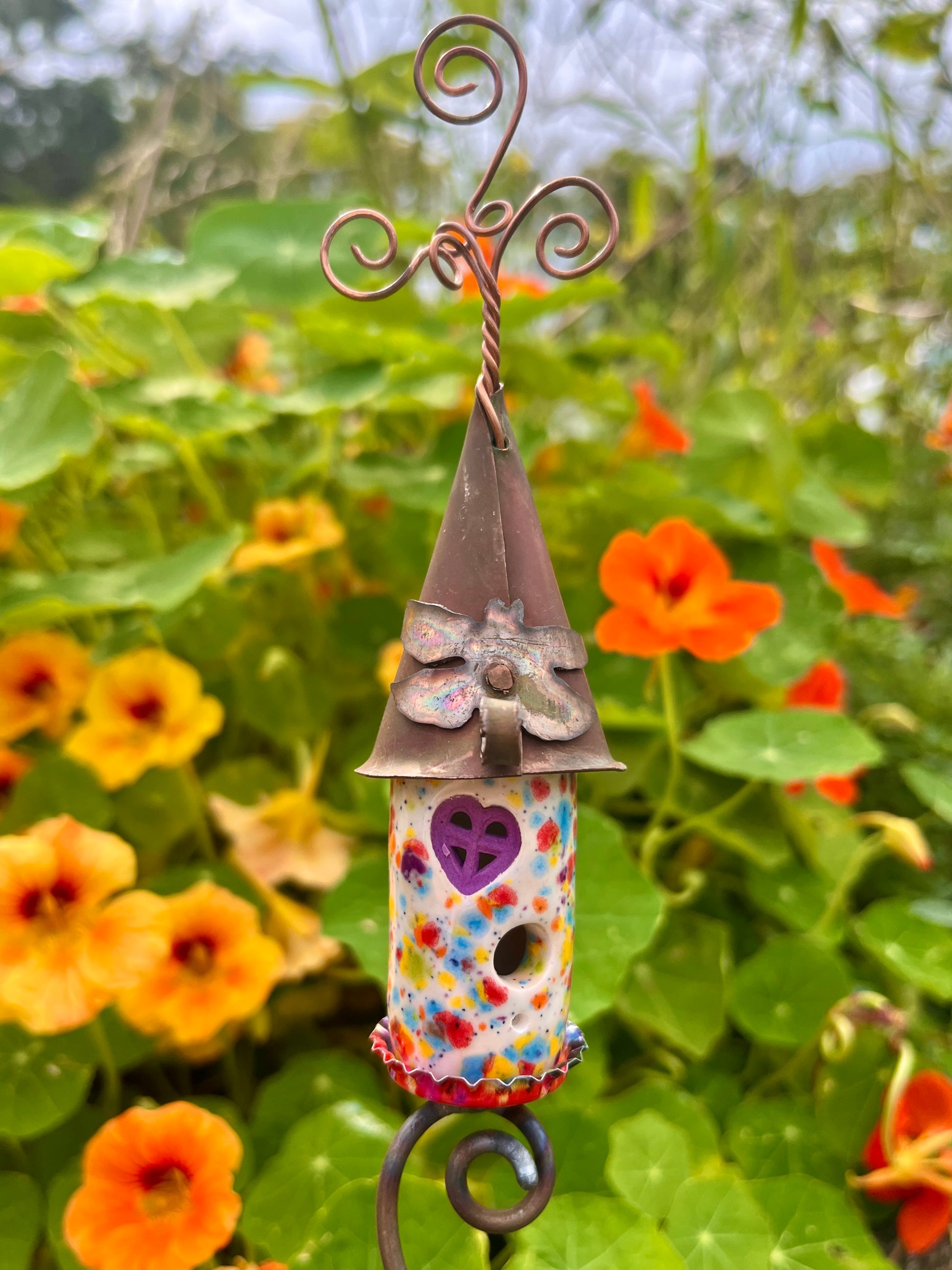 Dragonfly on the roof. Leads with love. Perched on 12 inch twisted stem. Lands easily in a potted plant, window box, or faerie garden. Twisted steel stem is intended to naturalize (rust up nicely), providing a nice little vine looking perch for the home. Curls may need adjustment after flight.