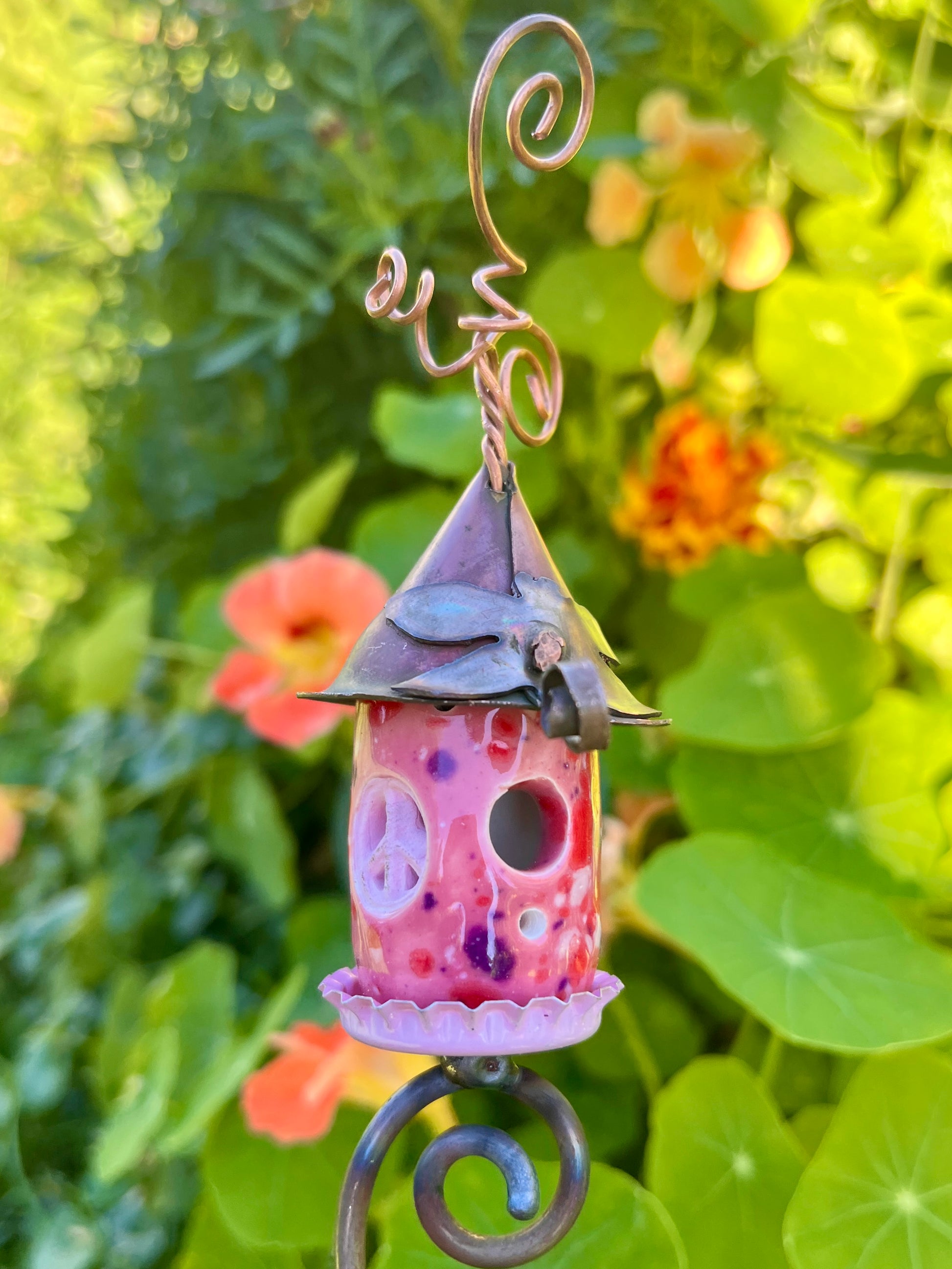 Leads with peace. Dragonfly on the roof. Pink accents. Perched on 12 inch twisted stem. Lands easily in a potted plant, window box, or faerie garden. Twisted steel stem is intended to naturalize (rust up nicely), providing a nice little vine looking perch for the home. Curls may need fluffing after flight.