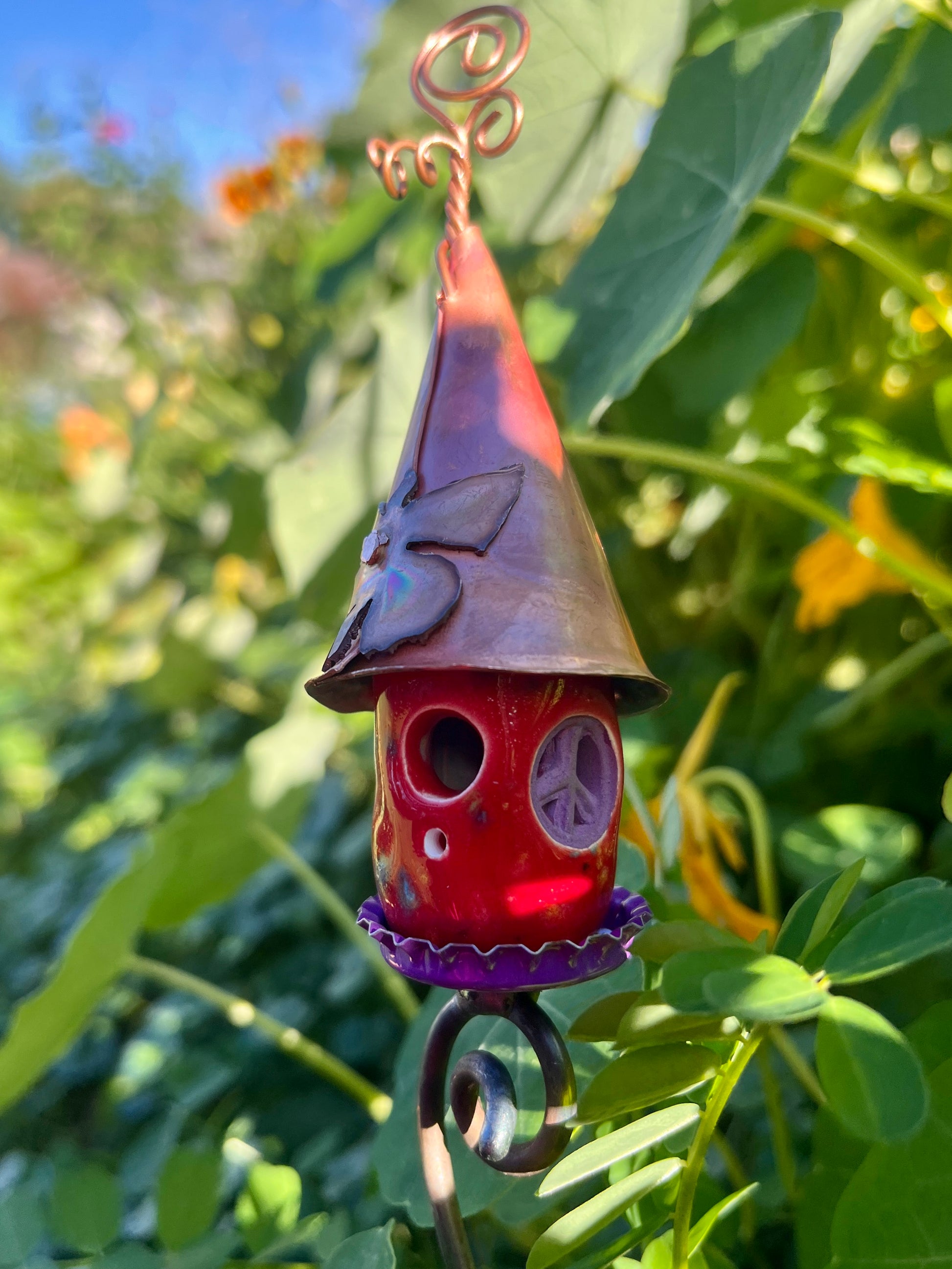 Leads with peace. Raw copper butterfly on the roof. Purple accents. Perched on 12 inch twisted stem. Lands easily in a potted plant, window box, or faerie garden. Twisted steel stem is intended to naturalize (rust up nicely), providing a nice little vine looking perch for the home. Curls may need fluffing after flight.