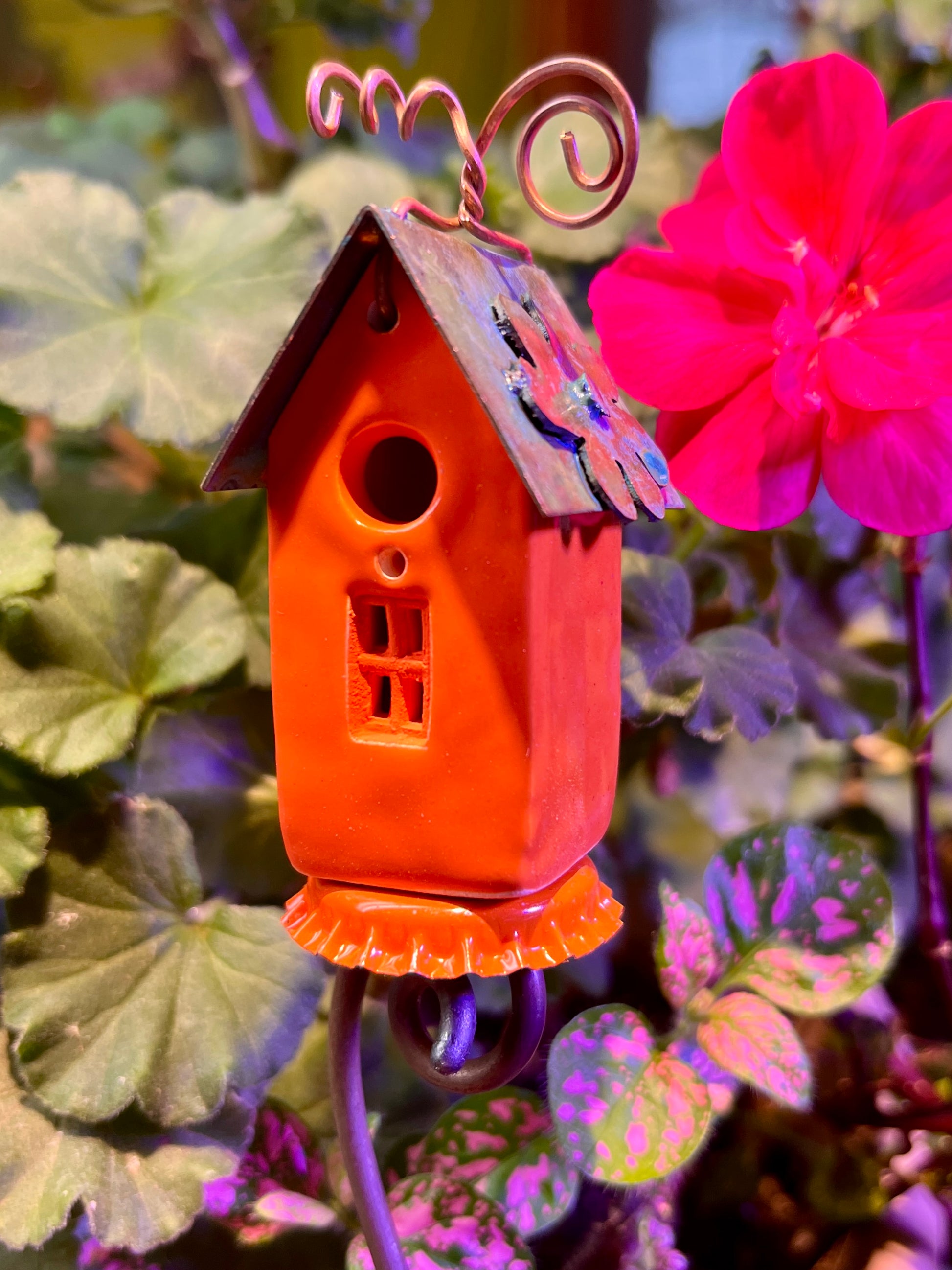 She’s looking for fun! Flower on the roof. Perched on 12 inch twisted stem. Lands easily in a potted plant, window box, or faerie garden. The twisted steel stem is designed to naturalize beautifully over time, developing a rustic patina that mimics delicate vines—creating an organic, lived-in look that only grows more magical with the seasons. *Curls may need fluffing after flight.