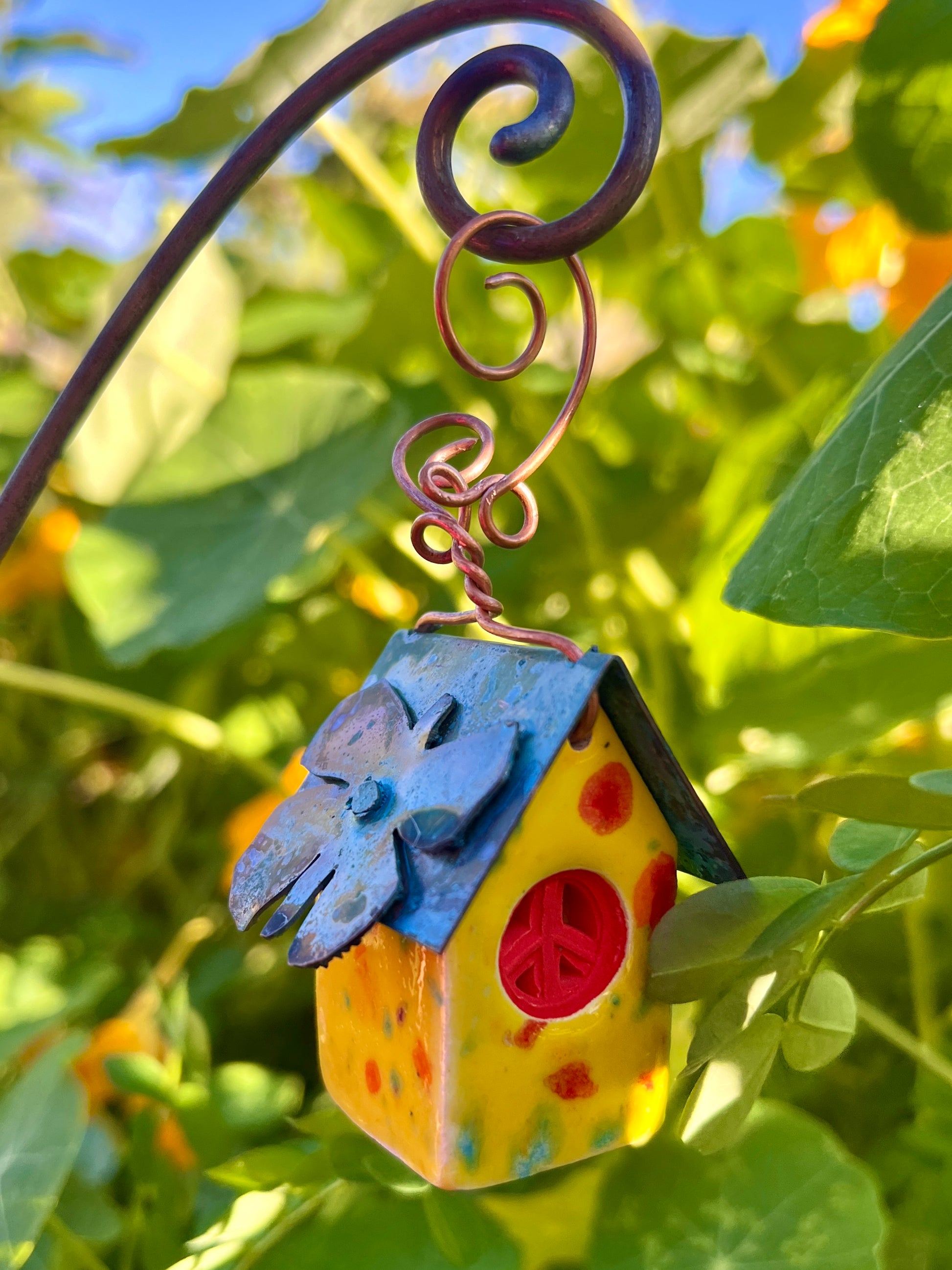 Red peace window. Butterfly on the roof. Includes 12 inch shepherds hook. Lands easily in a potted plant, window box, or faerie garden. Shepherds hook is intended to naturalize (rust up nicely), providing a nice little vine looking perch for the home.