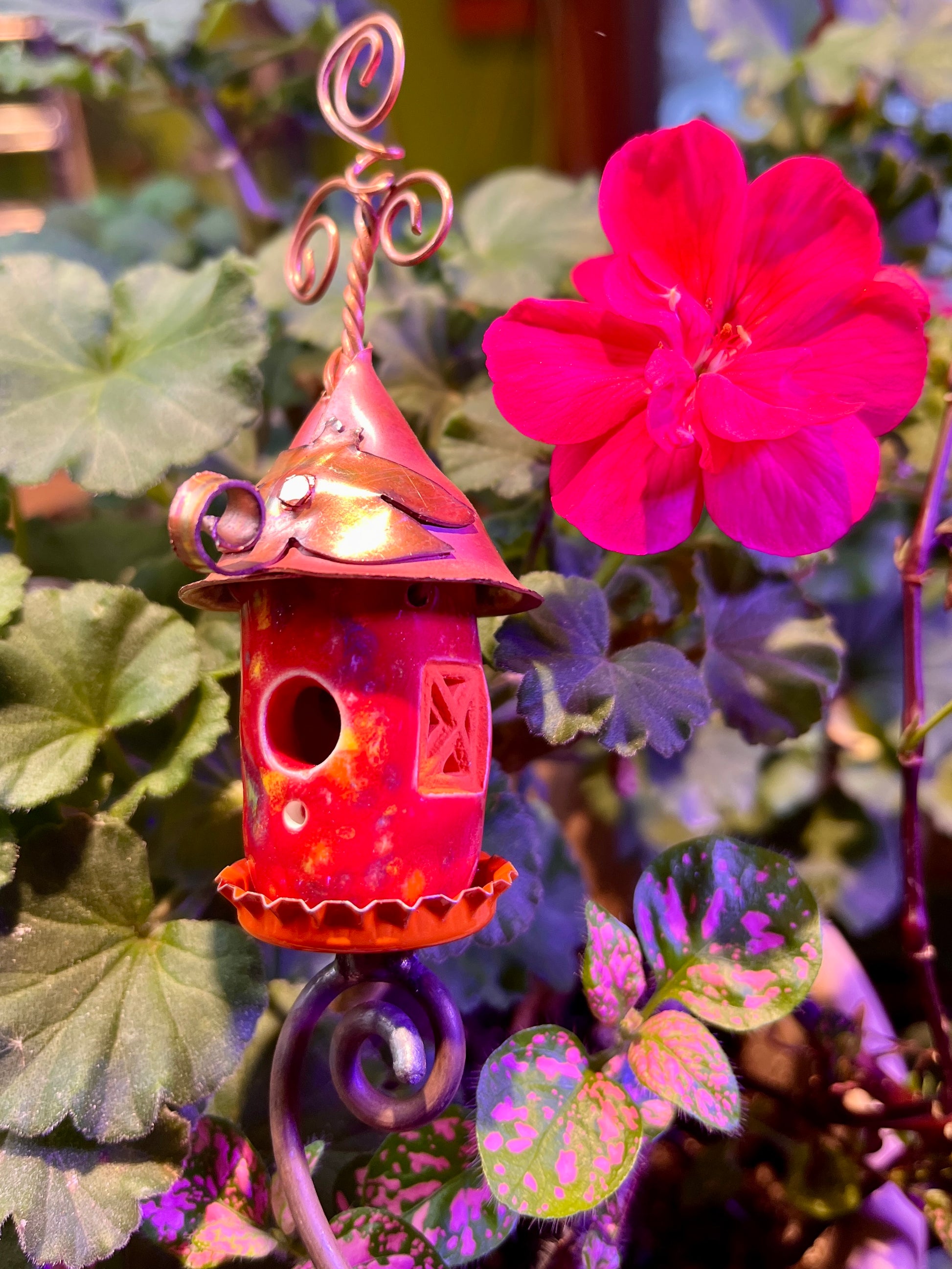 A copper dragonfly crowns the roof. Orange accents. Perched on 12 inch twisted stem. Nestles into any potted plant, window box, or faerie garden. The twisted steel stem is designed to naturalize beautifully over time, developing a rustic patina that mimics a delicate vine—creating an organic, lived-in look that only grows more magical with the seasons. *Curls may need fluffing after flight.