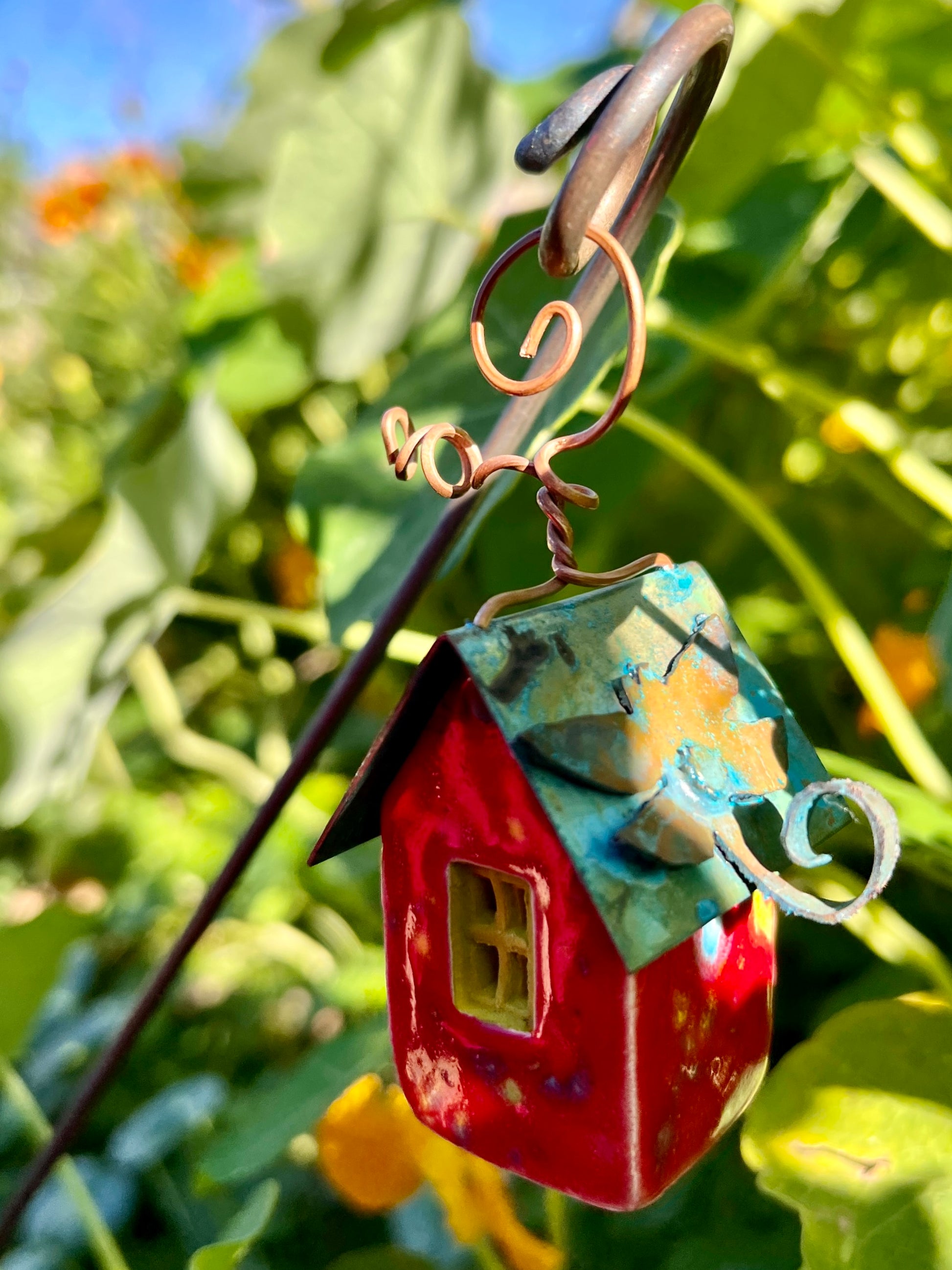 Lime green window. Dragonfly on the roof. Includes 12 inch shepherds hook. Lands easily in a potted plant, window box, or faerie garden. Shepherds hook is intended to naturalize (rust up nicely), providing a nice little vine looking perch for the home.